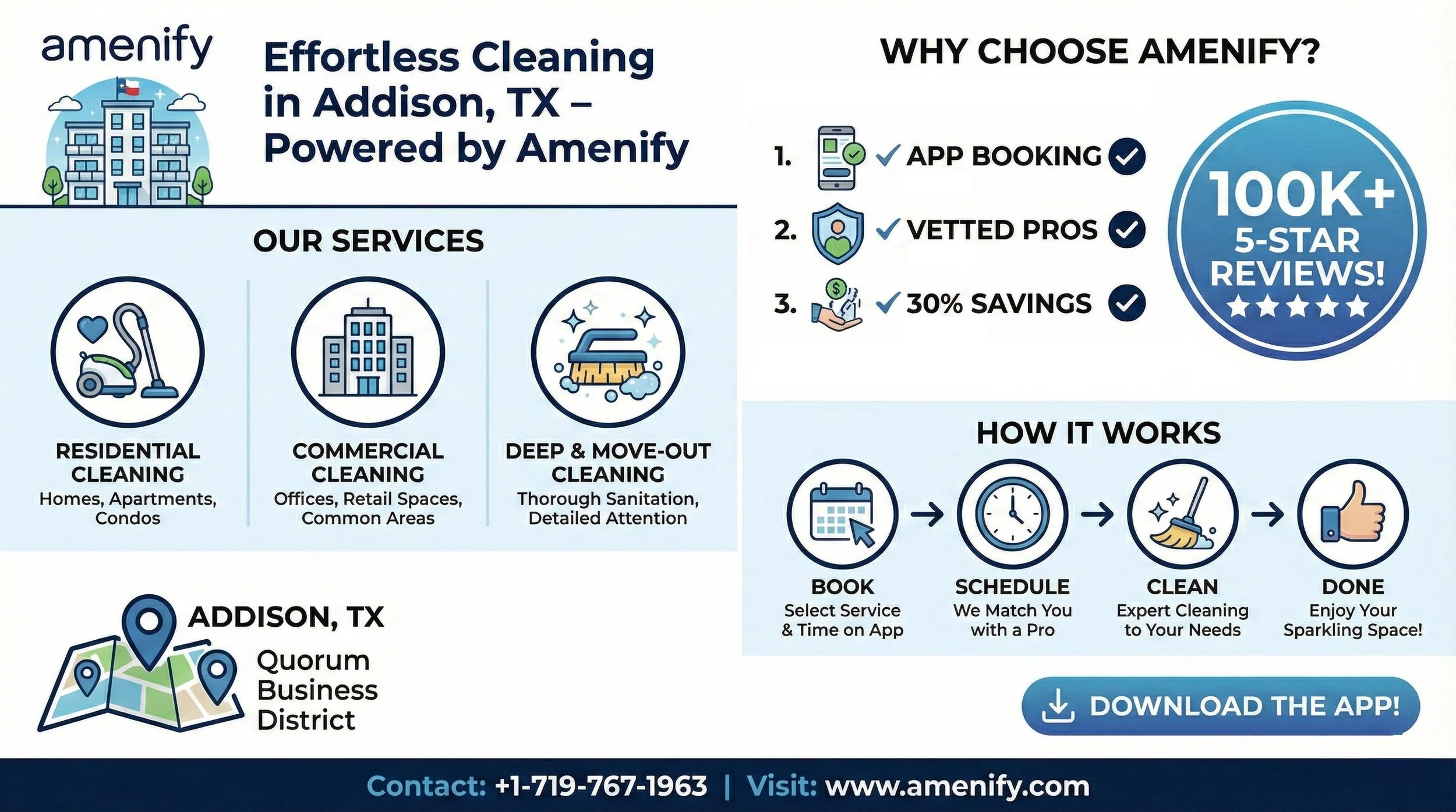 At Amenify Addison, we combine local expertise with professional standards to deliver cleaning that is timely, trustworthy, and tailored. Whether you need a regular home refresh after a weekend at Oktoberfest, a move-out clean near Quorum Drive, or office sanitization along the Dallas North Tollway, our service stands out by focusing on convenience, vetted professionals, and a service promise you can count on.