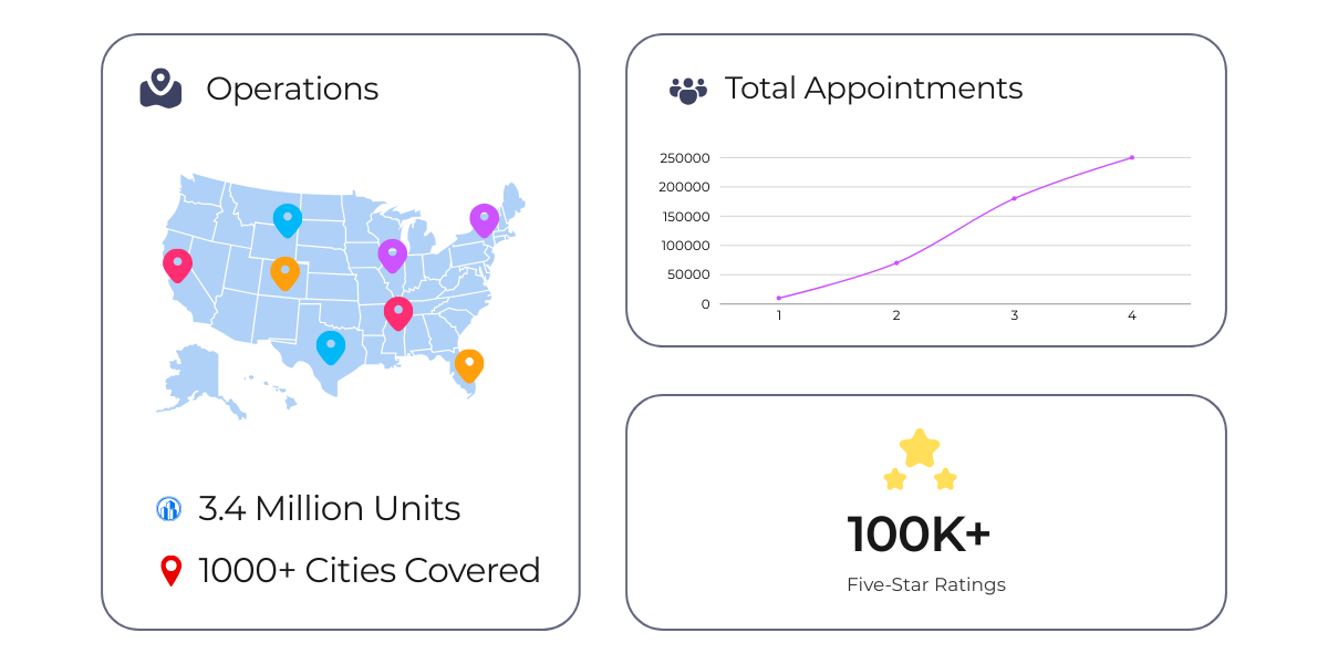 National Coverage → Operating in 1,000+ cities with a 99% completion rate.